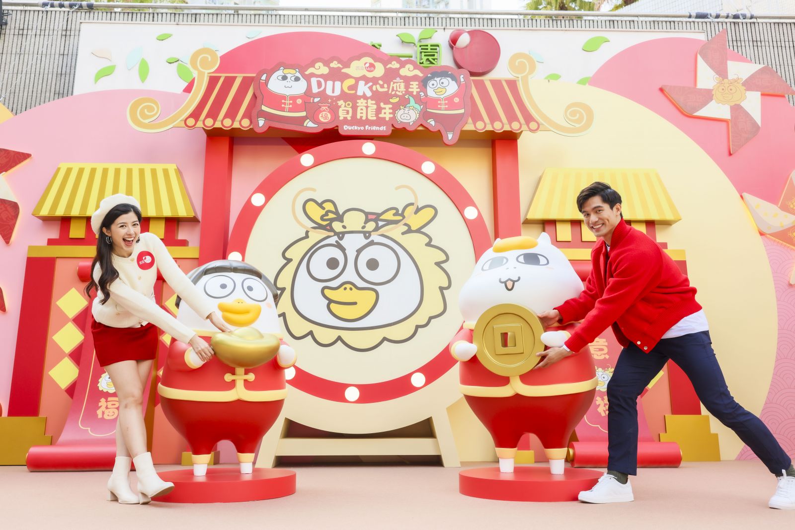 換上龍年賀年造型的小劉鴨與鼻孔喵穿上中式傳統服裝,手持着金元寶與金錢,於 3米高的祈福大鼓前面加持,祝福大家於來年行運一條龍。
