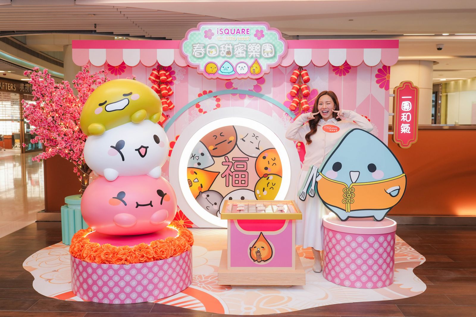 尖沙咀iSQUARE國際廣場於2026年1月23日至3月8日,聯乘香港插畫家品牌oh…little sweet呈獻春日甜蜜樂園,插畫家波比創作的十多名人氣角色:小湯圓、呆珠、柴火人、小水滴、在遠距離戀愛的棉花糖、咸蛋黃和抹茶圓等,以圓碌碌身形製造出甜度超標的3大「圓」美打卡區域,亮眼焦點的5米高巨型團圓福袋,小湯圓由袋中探頭外望,絕對是要以笑容萌倒地球人。