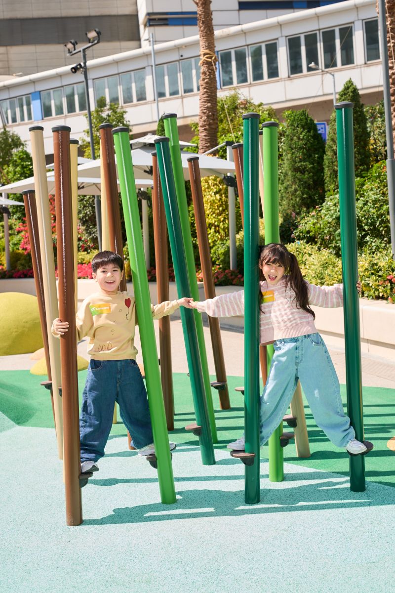 綠色遊樂環「感知區」連接動力區的興奮同時引領小朋友踏入「山丘秘境」,以設於地面的高低不平色彩繽紛小圓頂模擬自然山嶺,小朋友可以踏步跳躍同時尋找埋藏其中的聲樂感知體驗。想進一步挑戰訓練小朋友的體能與平衡力,就要來到「彈彈山丘」完成山丘彈床為大家帶來的飛躍動力考驗,之後到「竹林陣」變身攀爬高手,於不同高度與角度組成的竹竿中穿梭,大顯身手同時激活身體協調能力與感知體驗。感知區除了啟發大家的社交遊戲之外提供自由遊戲機會,發掘自己的遊樂可能。