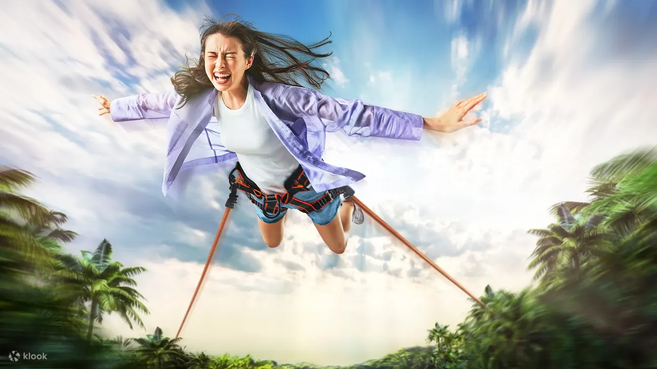 人體飛箭彈弓前一刻還在被拉扯著不斷向後倒退,下一個瞬間就已經衝進叢林,感受耳邊的風呼嘯而過,以極快速度飛躍,推向天際。