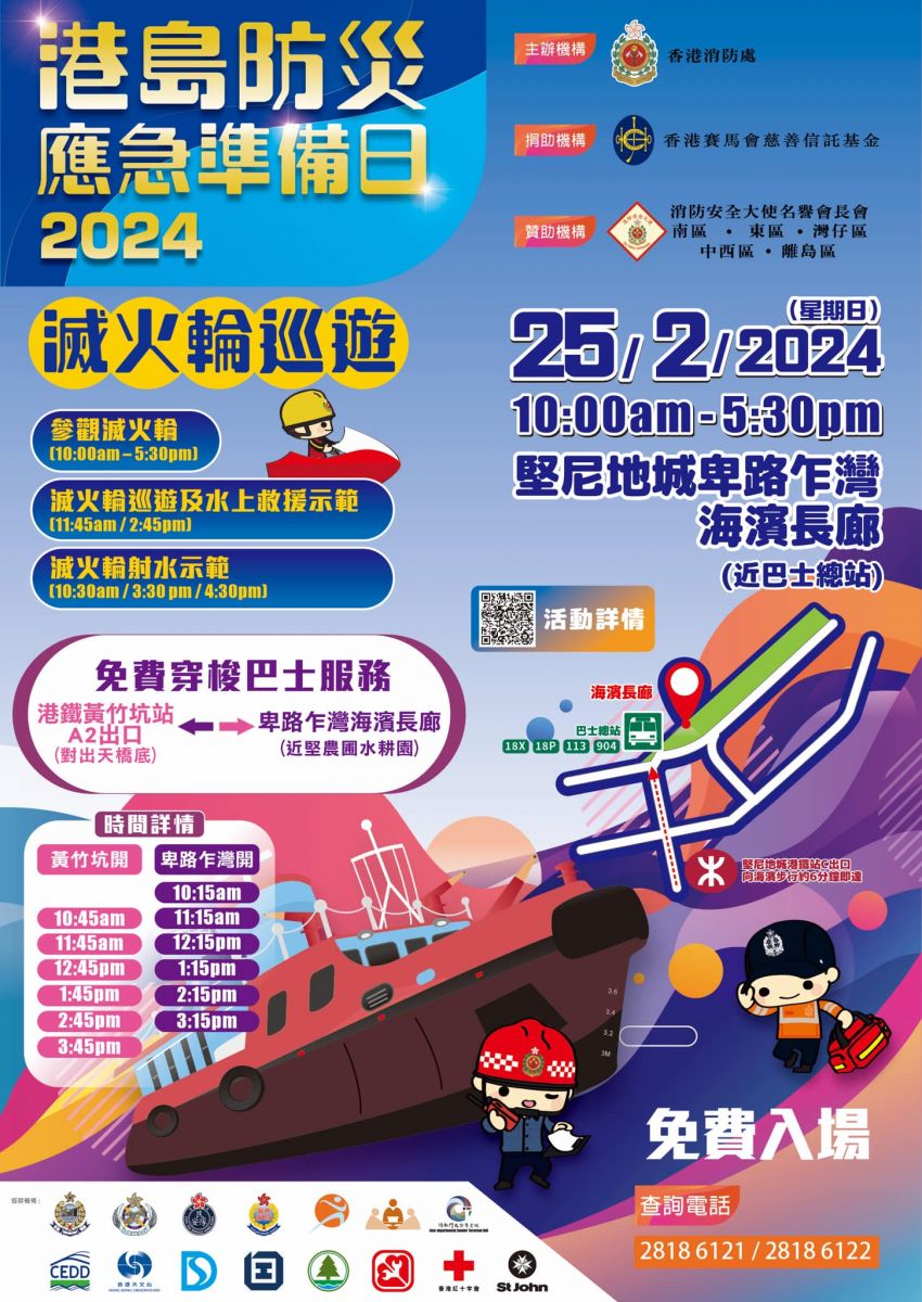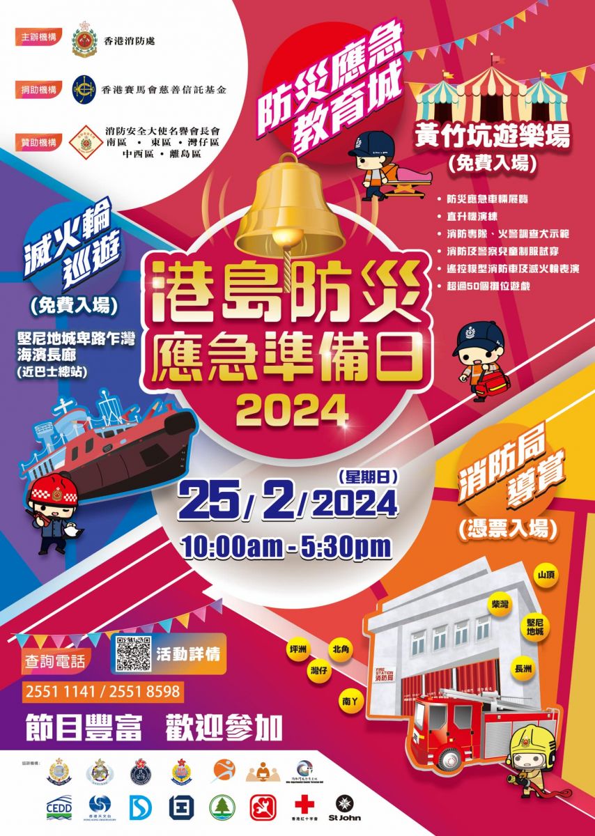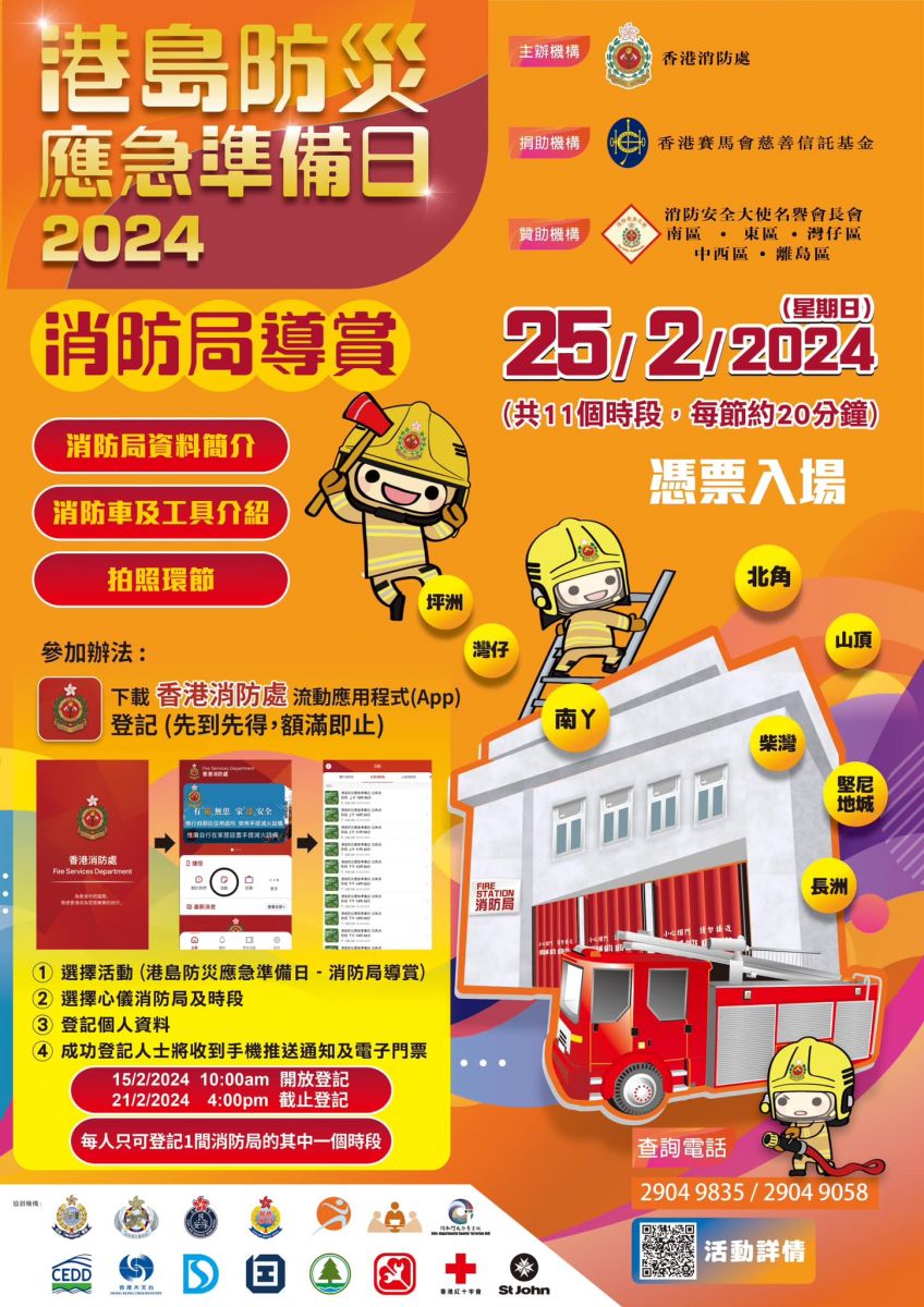 香港消防處將於2月25日舉辦「港島防災應急準備日2024」,一家大小可以免費入埸,精彩活動包括試穿消防及警察兒童制服、參觀滅火輪及玩攤位遊戲等。此外,同日亦開放8間指定消防局,大家可預先登記,憑票導賞,了解消防局歷史及消防員工作。
