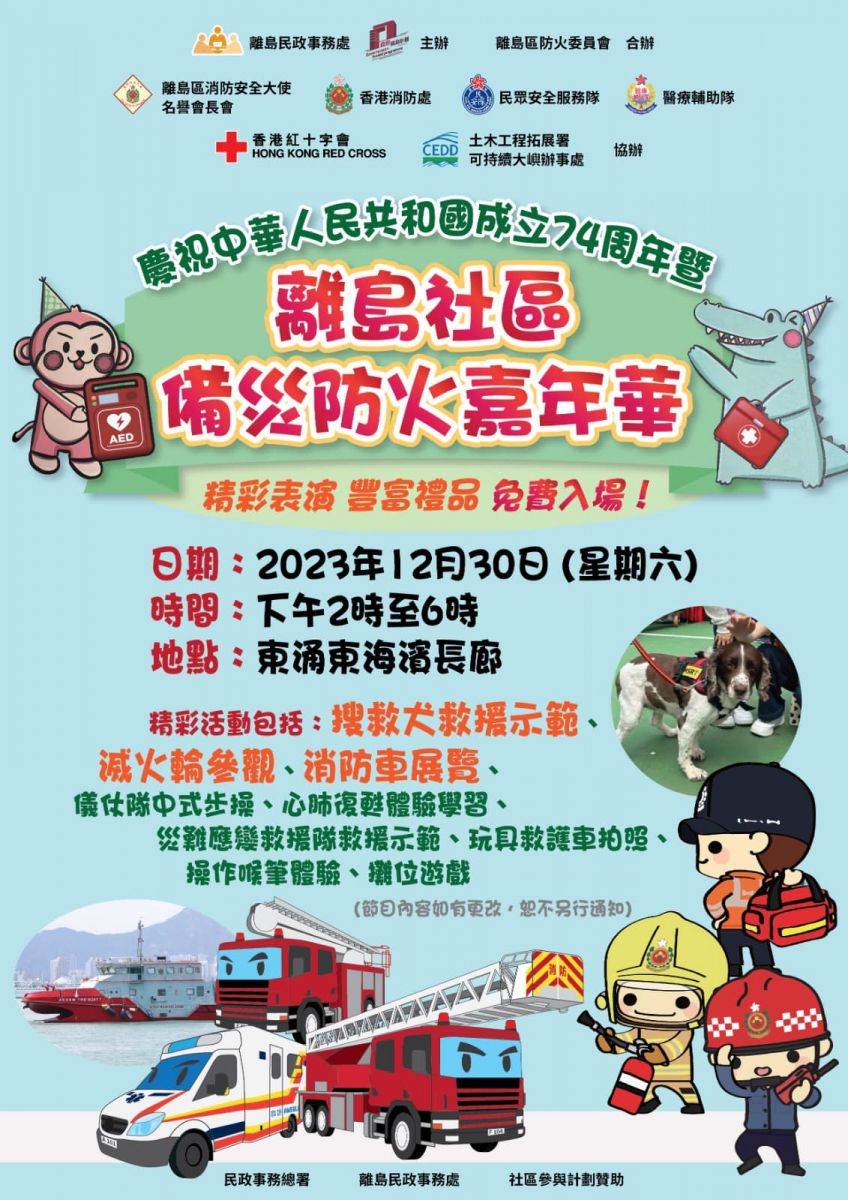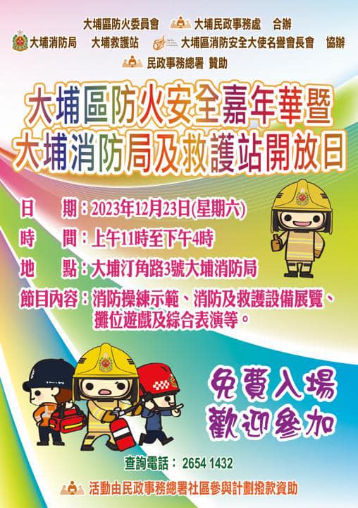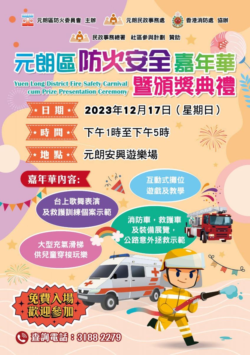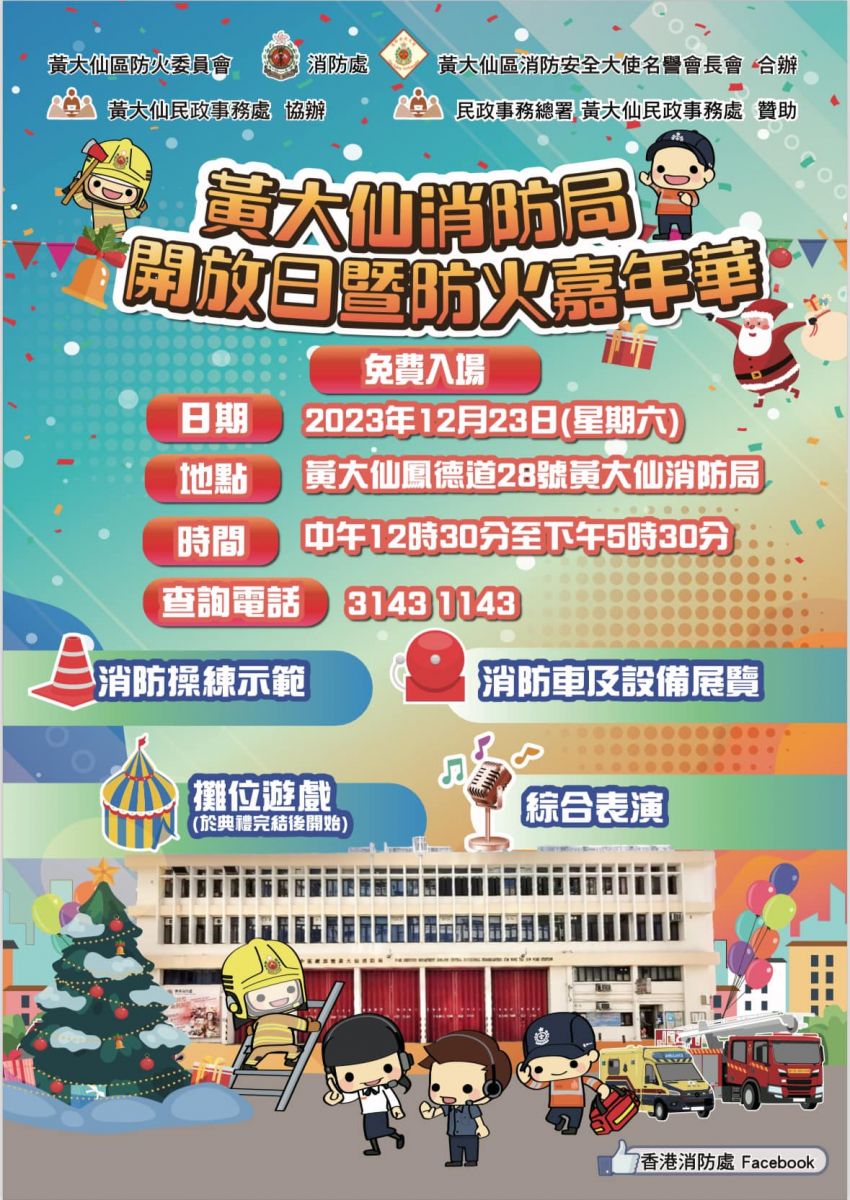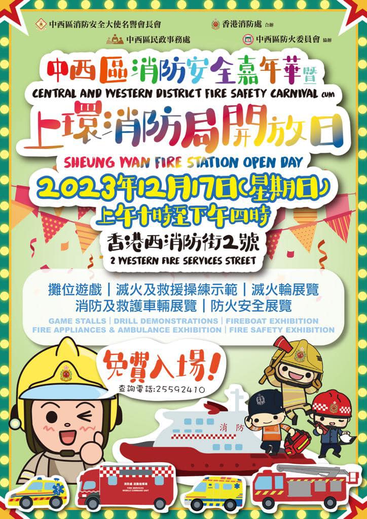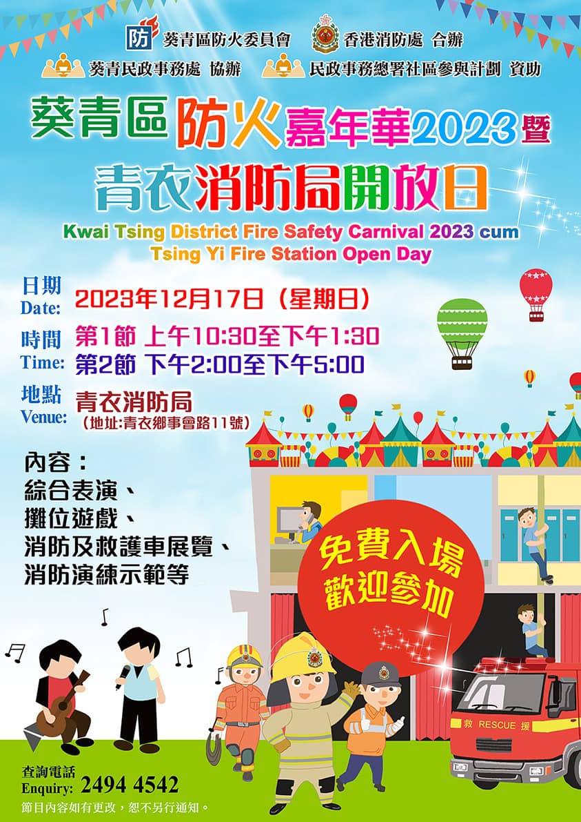 活動:消防操練示範、滅火機械人展示、火警調查犬表演、消防及救護車與工具展覽、攤位遊戲、綜合表演、免費爆谷及棉花糖等