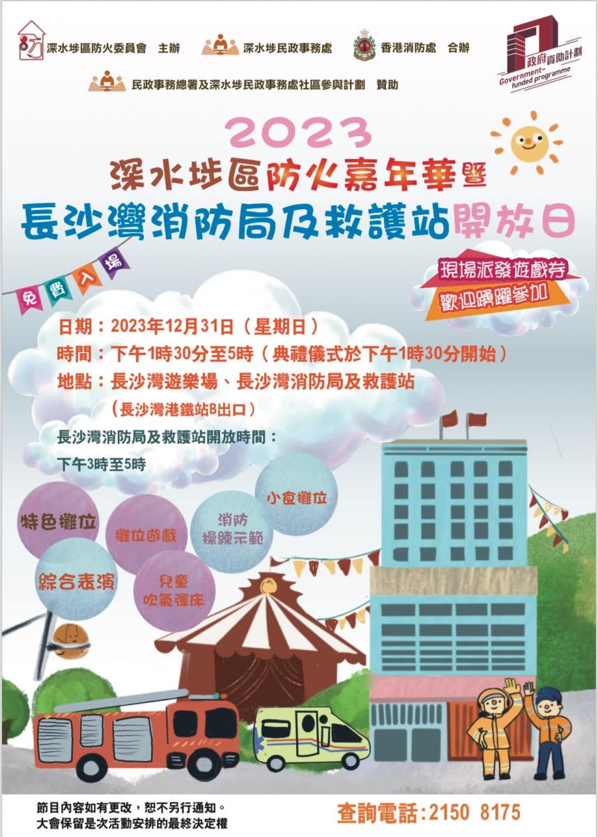 活動:特色攤位、綜合表演、攤位遊戲、兒童吹氣彈床、消防操練示範、小食攤位