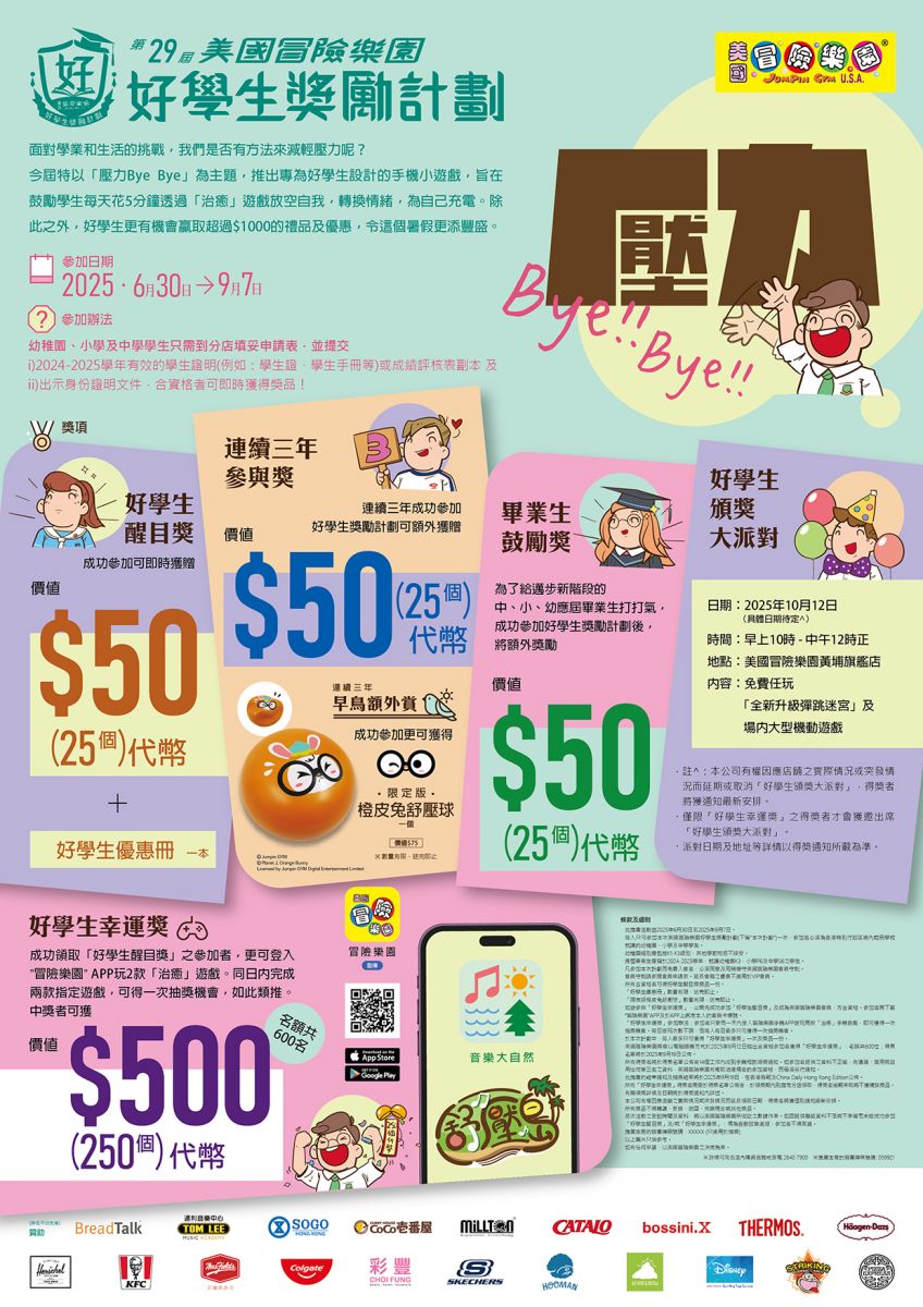 - 好學生醒目獎:冒險樂園 $50 代幣(25個)、冒險樂園 $200 代幣優惠券、冒險樂園$200生日派對優惠券和「好學生優惠冊」一本
