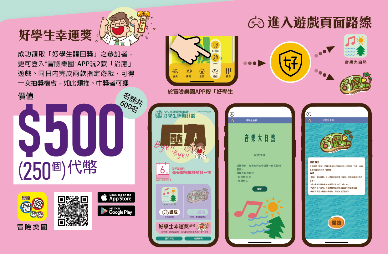 中、小、幼學生成功領取「好學生醒目獎」的參加者,更可登入 "冒險樂園" APP參與兩款指定「壓力Bye Bye 手機遊戲」,每日完成兩個遊戲,可得一次抽獎機會,如此類推。中獎者可得: 價值$500(250個)代幣及獲邀出席10月舉行的「好學生頒獎大派對」,在全新裝修的黃埔旗艦店免費任玩大型機動遊戲。名額共600名。