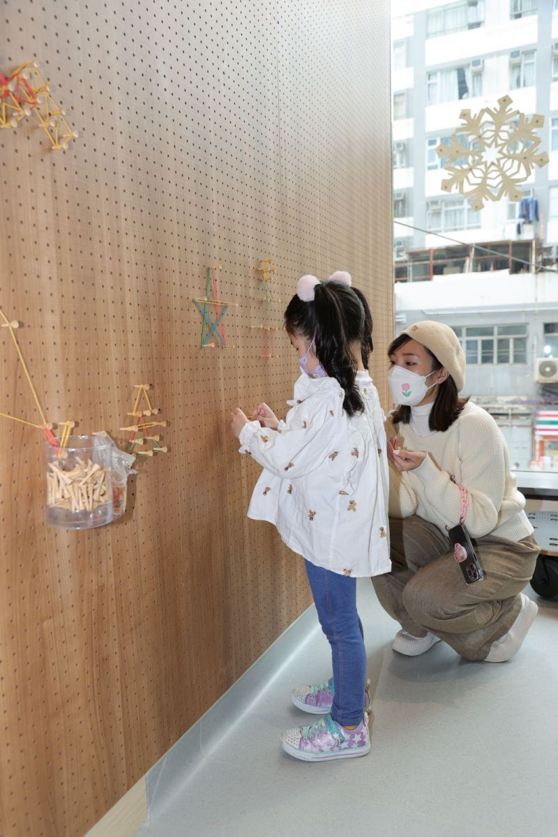 在這面洞洞板上,孩子可以發揮創意,運用木釘和橡筋創作出獨特圖案。
