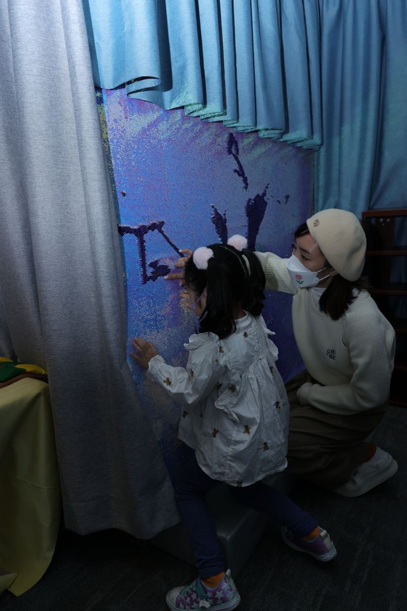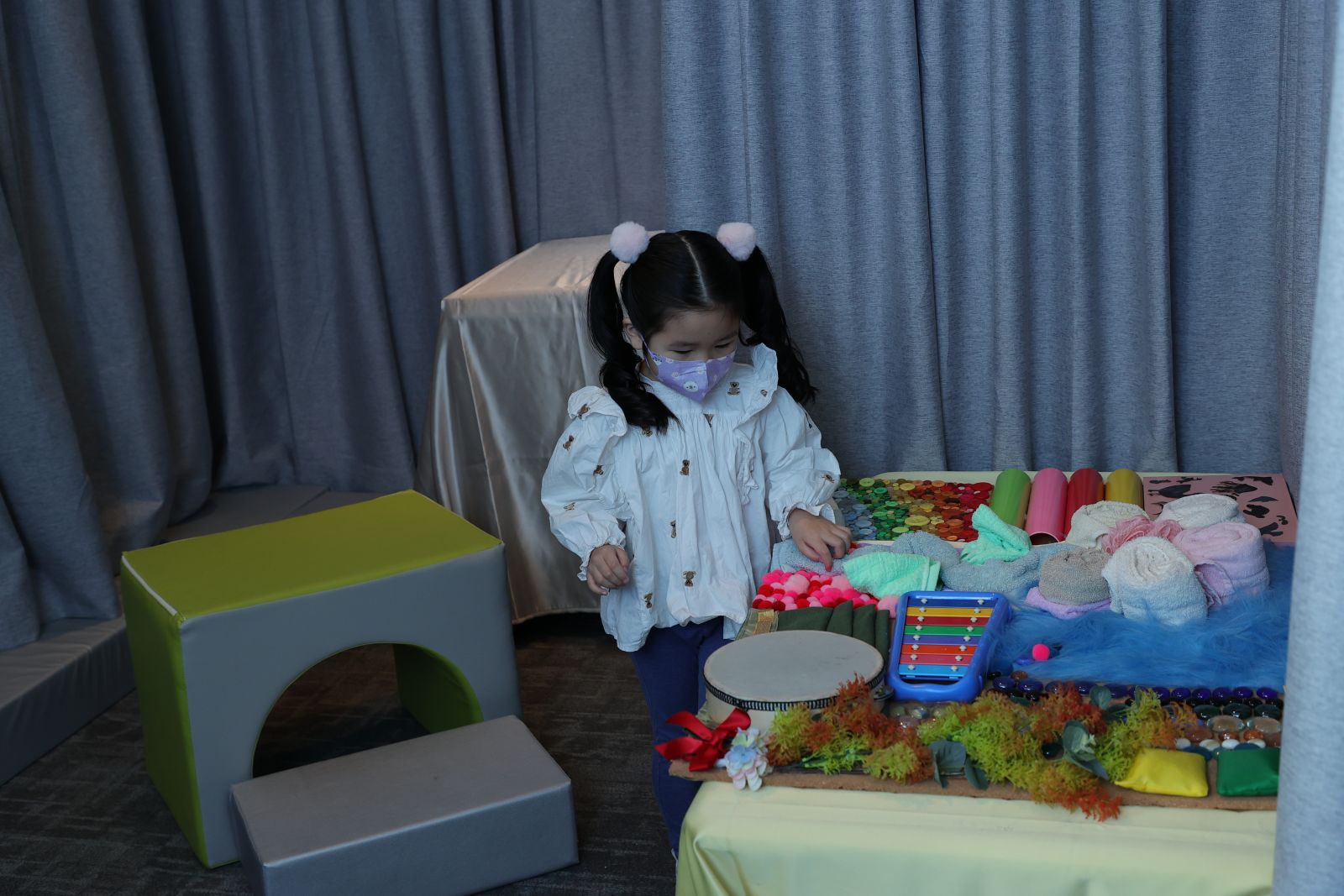 用特別燈光效果設計的房間裏,擺放着不同質感與音色的玩意,從而刺激孩子的各個感官。
