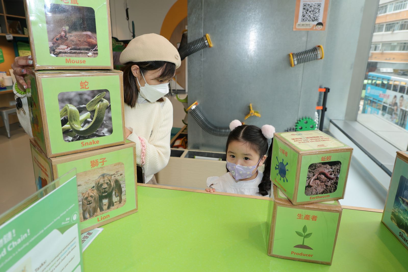 拍攝當日,活動桌正以「食物鏈」為題,家長可運用各個盒子,向孩子講解資訊。