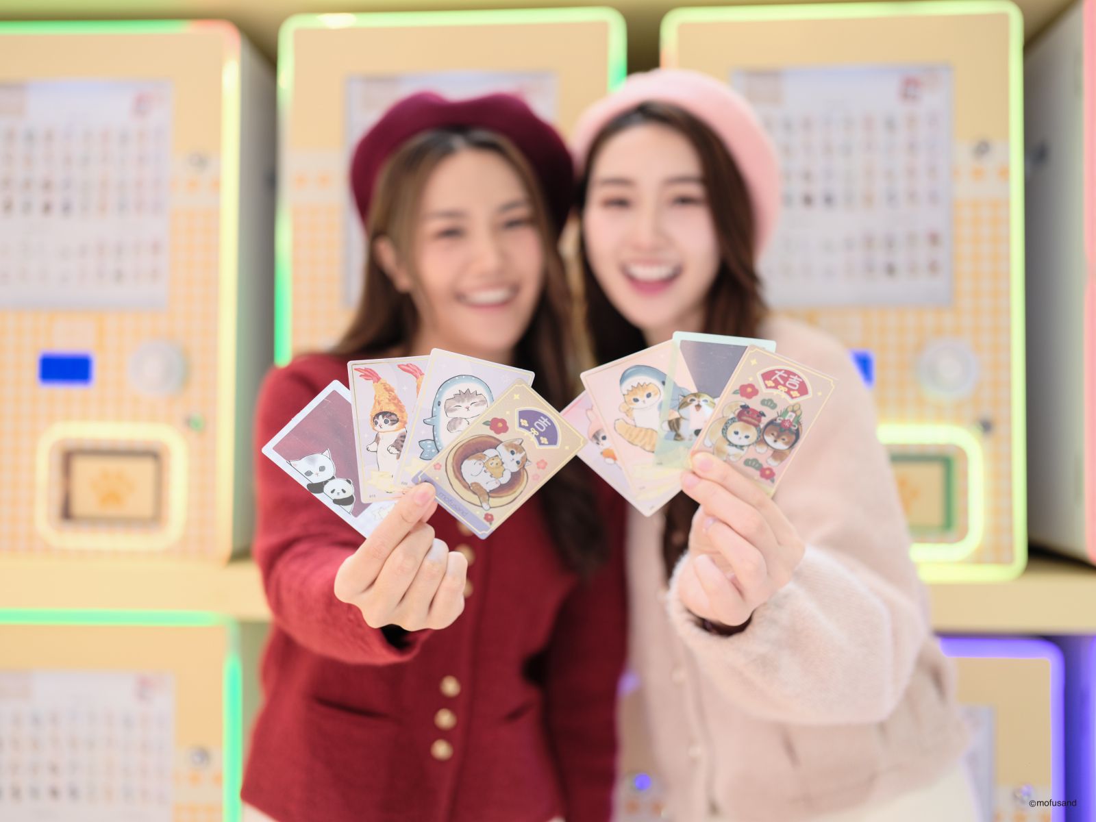 The ONE「貓福期間限定店」當中最矚目的是會場限定扭卡機,盲抽60款mofusand Q萌珍藏卡,除了有燙金卡及透明卡,每包珍藏卡中都會有一款幻彩別注版(8款其中1款)。另外,大家更可入手mofusand賀年版新春手玉公仔,除了可以把mofusand捧在手心,更可任意配搭不同款式及底座成為獨一無二的賀年擺設。另外,大家只要消費滿指定金額即可換領mofusand「幸福貓生利是封」,更可獲「家有為食喵揮春」一套。