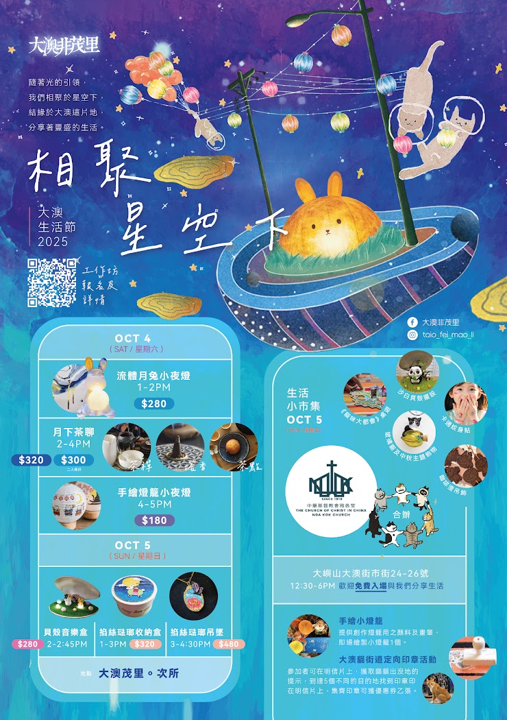 在中秋一輪明月下,約140攤本地文創品牌與大家吹著夜風,齊齊於市集中感受手作藝術的饗宴,有水燈許願池、特色工作坊等,並歡迎帶同毛孩來過中秋同行市集。@Lifemart 更與饒館及不同社區組織合作,透過舉辦免費手繪花燈工作坊,收集了 逾2000個由市民參與繪畫的花燈,掛滿在饒館戶外位置燈海場面十分壯麗。