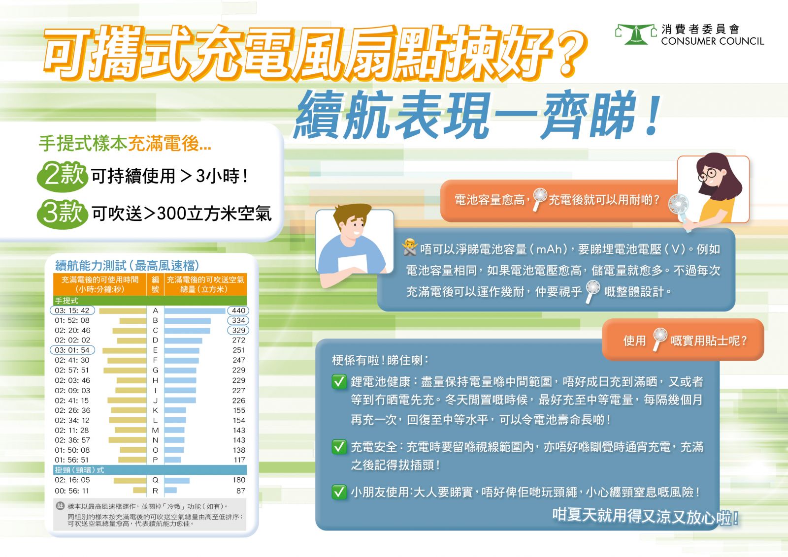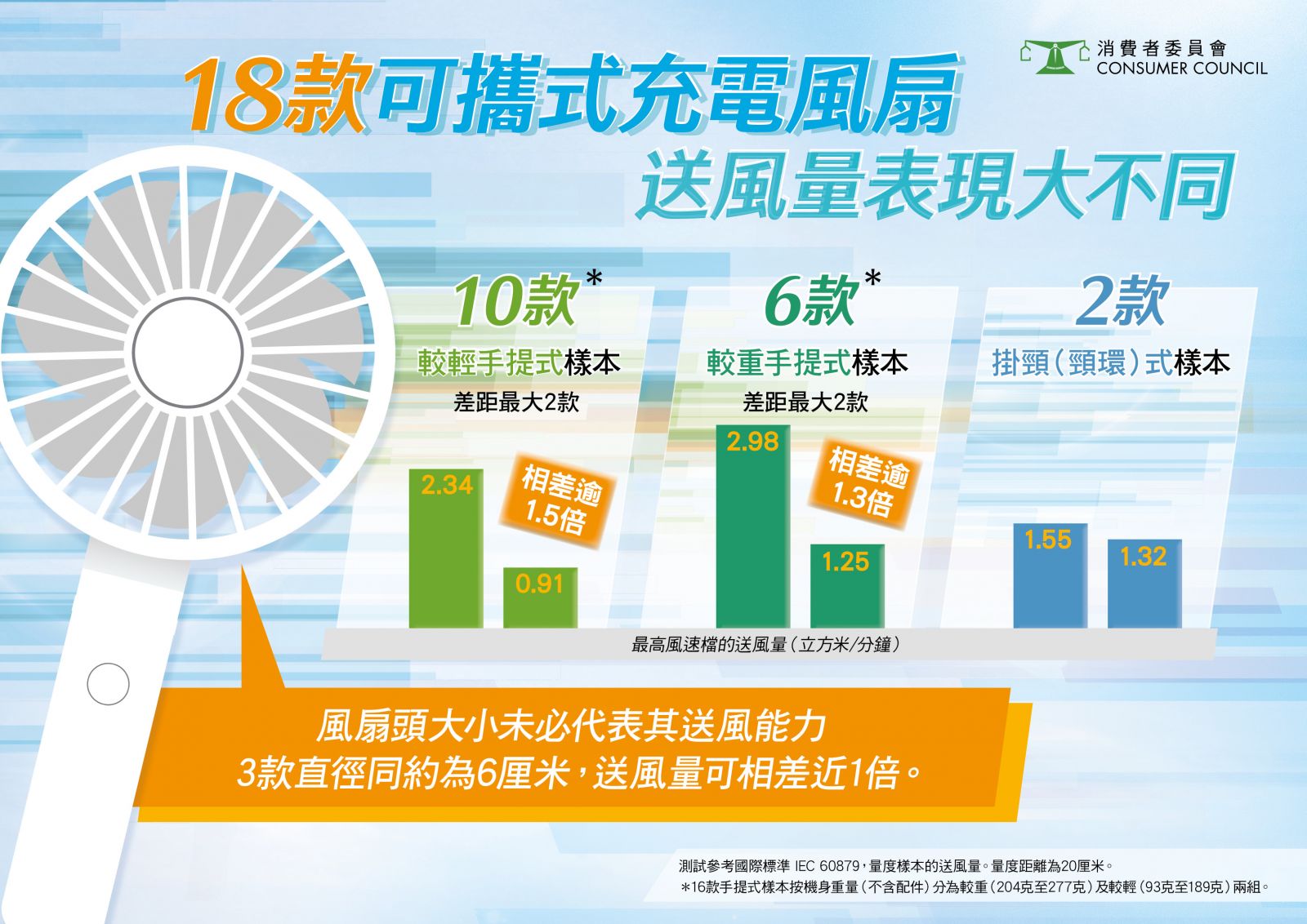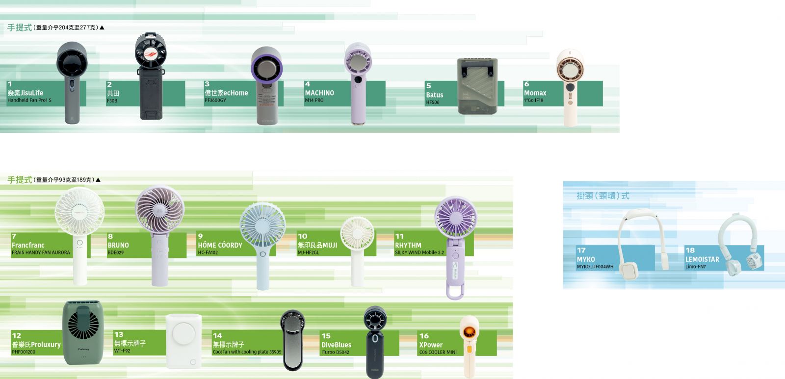 是次測試涵蓋18款可攜式充電風扇樣本,包括16款手提式及2款掛頸(頸環)式設計。16款手提式樣本中,部分備有附件作掛腰式或掛頸(頸繩)式之用,設計包括傳統風扇造型、長方體機身等,以吹送空氣協助用戶降溫為主要功能。 測試項目包括樣本的安全程度、送風量、充電效率、續航能力、省電程度、寧靜程度及使用方便程度。結果發現,手提式樣本有6款同獲4星半總評,當中包括售價最高及最低,和最重及最輕的樣本。