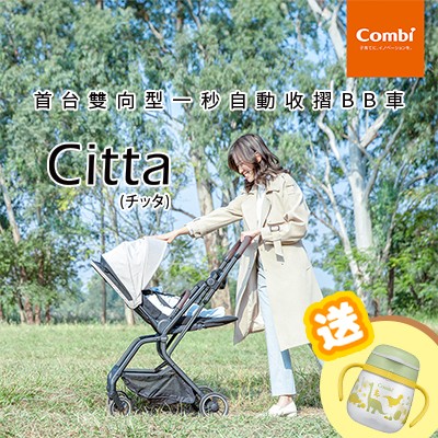 Combi首台雙向型一秒自動收車Citta登場,符合歐盟EN 1888-2認證,承重達到22kg 約0-4歲適用的舒適寬敞BB車,秒收設計只需要輕輕一按解鎖後,一放手BB車便會自動直立收接,完全不費氣力,就算一人帶B也可以容易使用。收摺後只有57cm x 44cm x 54cm,猶如一台輕便行李箱,收納外出更加便利。全新設計可提攜式快拆轉換座椅,只需要一提二放,隨時隨地轉換座椅方向,不再分前後向收車,更加方便每一位使用者需要。