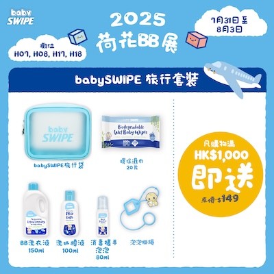 旅行套裝包括:babySWIPE 旅行袋、嬰兒衣物濃縮洗劑 150ml、奶瓶及蔬果濃縮洗劑 100m、消毒搓手泡泡80ml、泡泡掛繩 x 1、環保竹纖維濕巾20片
