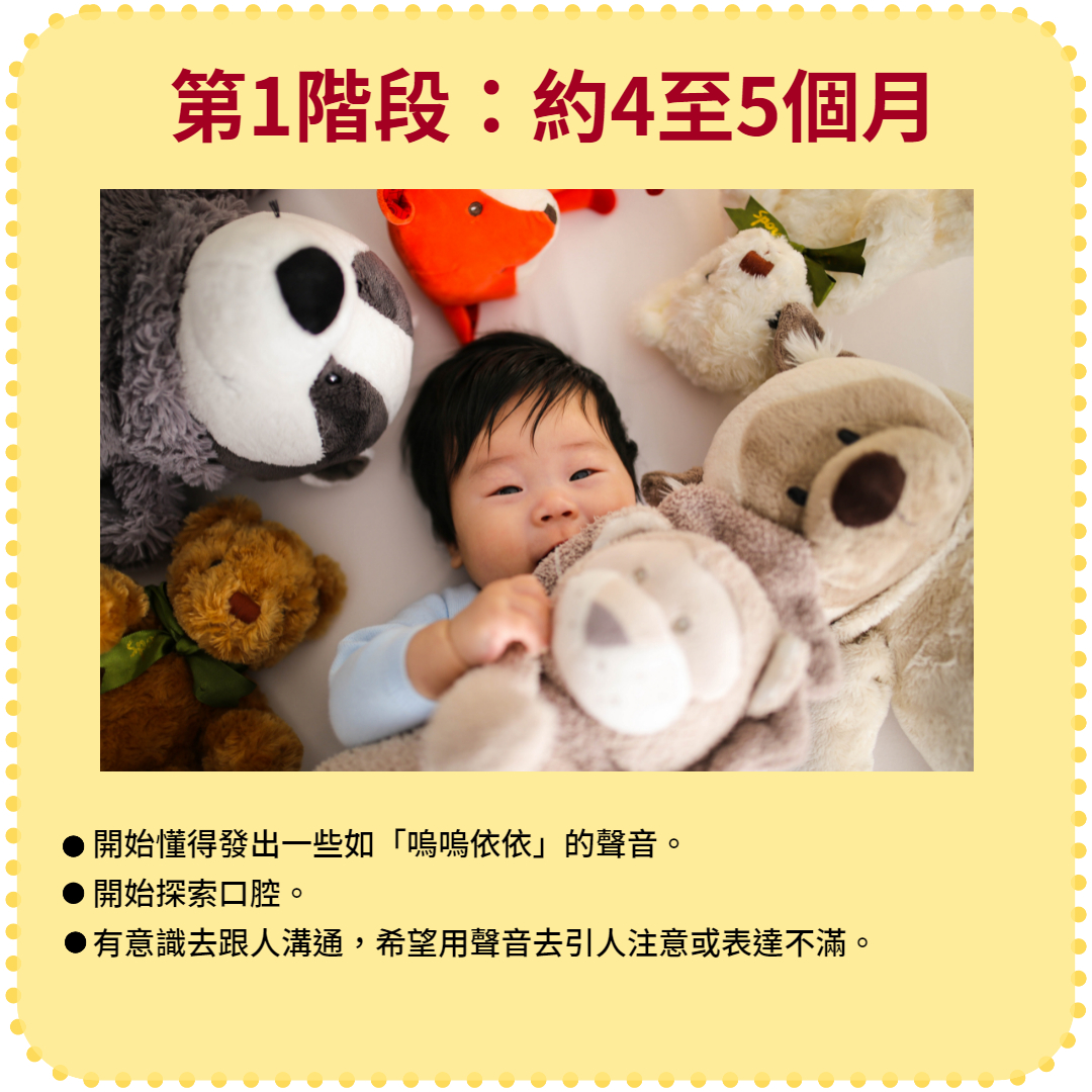 2. 開始時是一些簡單的單音,例如「爸」。接著就會「爸爸爸爸」,不斷重複同一個音。再進化就是兩個音的轉換,例如「爸咕爸咕」。