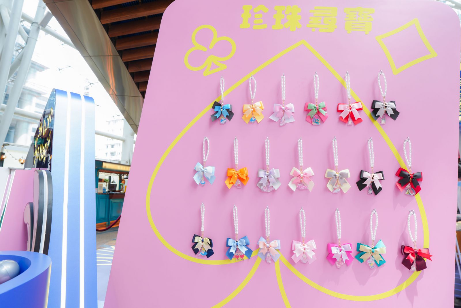 茶會場景延伸設有兩張巨型撲克牌,背後珍珠尋寶互動區。顧客可購買專屬珍珠寶寶,可從頂部投入珍珠,看著它穿梭而下——當珍珠落入指定顏色的寶藏格,即可獲得神秘扭蛋一顆,每顆扭蛋都藏有隨機限量多用途掛飾,親手揭開,尋找專屬的驚喜小寶藏。