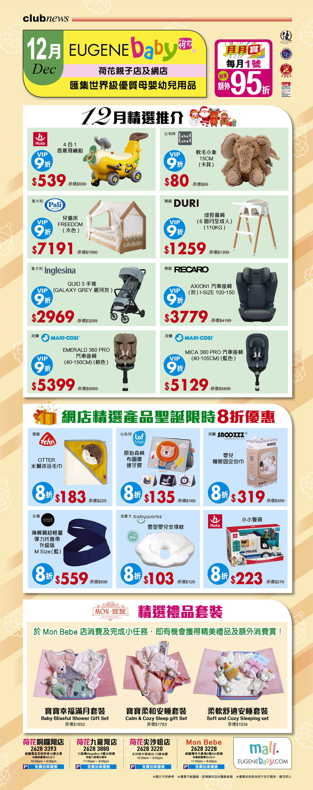 精選推薦:包括荷蘭MAXI COSI MICA 360 PRO 汽車座椅及EMERALD 360 PRO 汽車座椅、德國 RECARO AXION1 汽車座椅、意大利INGLESINA QUID 3 手推車、意大利PALI 意大利兒童床 FREEDOM、韓國 DURI 成長餐椅、比利時LABEL LABEL 軟毛小象、HOLA 4合1 香蕉飛機船。 現在成為 VIP 更可尊享全場 9 折優惠,千萬別錯過!